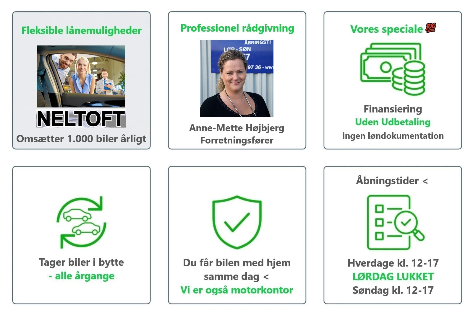 Neltoft Gruppen er centrum for et kæmpe udvalg af billige brugte biler til de rigtige priser. Alle vores brugte biler kan finansieres med 0,- kr. i udbetaling op til 299.900,- kr. Biler der koster over det beløb kan finansieres med 20% i udbetaling.